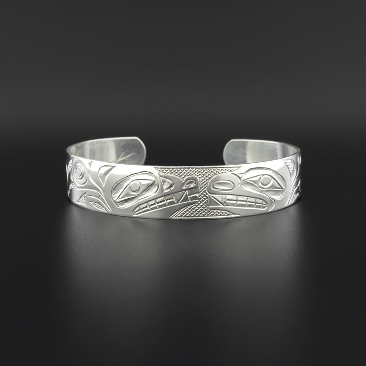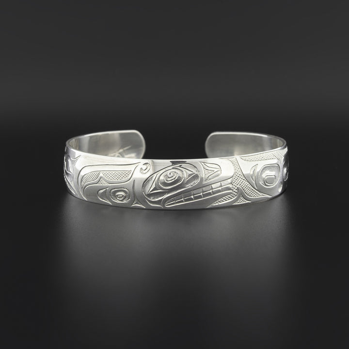 Kelvin Thompson carves jewellery in silver and gold, but also creates bowls and masks from alder, maple, and cedar. In 1979, he studied under and worked with Haisla artists Barry and Derek Wilson at the Vancouver Aboriginal Friendship Centre, and in 1980, he carved a totem pole with Haisla carver Henry Robertson for the Aboriginal Friendship Centre in Vancouver, BC. Kelvin has been adopted into Henry's Haisla family. From oxidizing to intricate cut-out work, Kelvin is always experimenting and trying new things with his jewellery. In addition, he has taught many artists how to carve in silver and gold, and he is passionate about passing skills and information on to younger carvers. From September 2007 to February 2008, Kelvin aided Haida/Kwakwaka’wakw artist Dan Wallace in teaching the first annual Northwest Coast Jewellery Arts Program at Vancouver’s Native Education College. In 2009, Kelvin was commissioned to engrave five cuff bracelets for James Taylor, Elvis Costello, Diana Krall, Elton John, and Vicki Gabereau for the Vancouver General Hospital & the University of British Columbia's Hospital Foundation fundraiser An Evening with Diana Krall. In 2019, he was featured in the landmark publication Understanding Northwest Coast Indigenous Jewelry by author Alex Dawkins.
