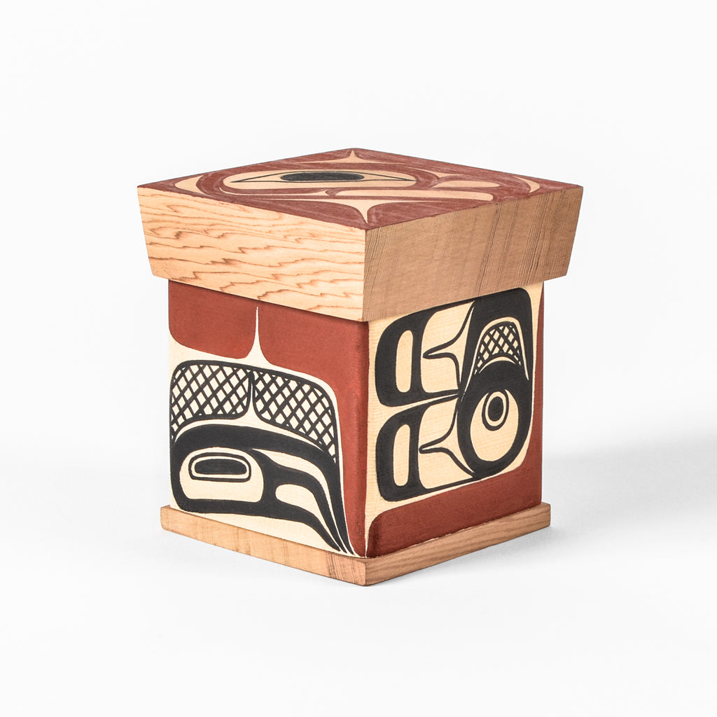 David Boxley is an artist of national prominence, noted both as a carver and a performer in Tsimshian dance. He attended Seattle University, where he received a Bachelor of Science degree in 1974. Afterwards, he became a Junior and Senior High School teacher, and basketball coach in Metlakatla in 1979. At this time, he began to study traditional Tsimshian carving techniques. In 1982, he carved the first pole to be raised in the town of Metlakatla. In 1986, he made a major career change toward carving and researching Northwest Coast art. Since this time, he has exhibited his work in many different countries worldwide, received many commissions, and has taught and demonstrated at museums worldwide. David has also been deeply involved with the rebirth of Tsimshian culture through organizing and hosting Potlatches in Alaska and Washington. He was responsible for the 1996 Seattle Northwest Coast Potlatch, the first in one hundred years. David also has been directly involved in the formation of two successful dance groups in Metlakatla, Alaska, and Seattle, Washington. He is the leader of the Tsimshian Haayuuk in Seattle, and has written over 25 songs in his native language. In 1990, Boxley was commissioned to carve the crown of a talking stick depicting a Russian Bear and an American Eagle as a symbol of peace and harmony between the USA and Soviet Union for the Goodwill Games. Messages from both presidents, George Bush and Mikhail Gorbachev, were placed inside of the talking stick, and athletes carried the stick from Spokane through Washington, Oregon, and onto Seattle for the opening ceremonies. In 2015, David and his son, David R. Boxley, were commissioned by the Sealaska Heritage Institute to create one of three monumental works of art for the Walter Soboloff Building representing Alaska's three tribes: Tlingit, Haida, Tsimshian. It was a caved and painted longhouse front.