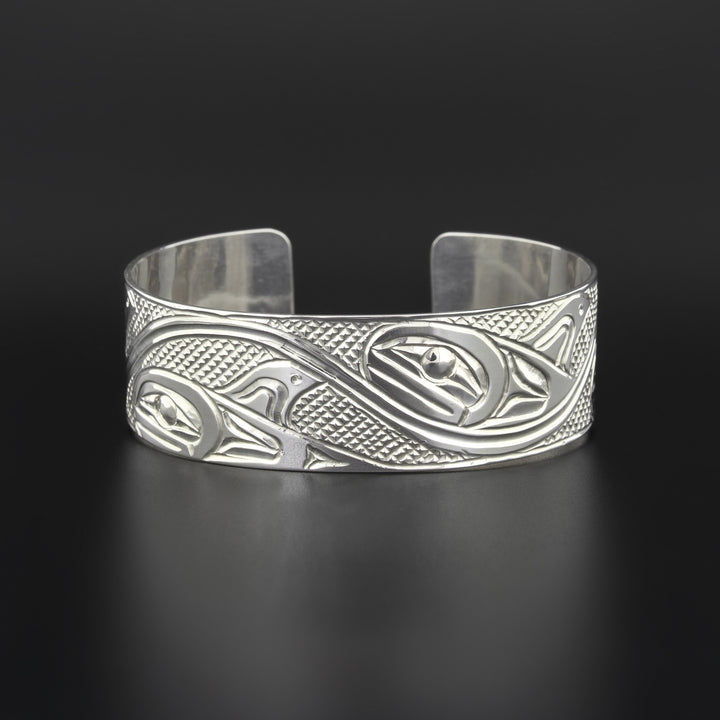 Carrie Matilpi holds Kolus, or Baby Thunderbird, as her crest, and works in the Kwakwaka'wakw style. Known for her gold and silver jewellery, Carrie learned to engrave from her father, Charles Harper. She has been carving since 1996, and often works with her sister, Victoria Harper.