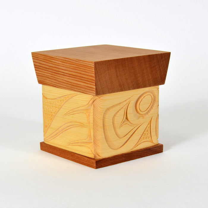 James Michels began his carving career in 1994, shortly after working at a log home company. He now specializes in making steam-bent cedar boxes, and carving and painting them in Northwest Coast style. Many of his pieces contain inlays of abalone. James also creates panels, and works on commission. One of his commissions involved the creation of custom bentwood boxes for the participants of the 2005 PGA Golf Skins Game in Whistler, BC. James apprenticed with Coast Salish artist, Joe Campbell, with whom he learned design, carving, and painting techniques. James also cites Carrier artist, Larry Rosso, as a source of inspiration. In July of 2008, James created a large bentwood box entitled The Mendl Gathering, which was commissioned through the Royal Bank of Canada. It measured 32” x 25” x 22”, and contained abalone inlays and operculum shells. James is a founding partner of Lattimer Gallery's Annual Charity Bentwood Box Event.
